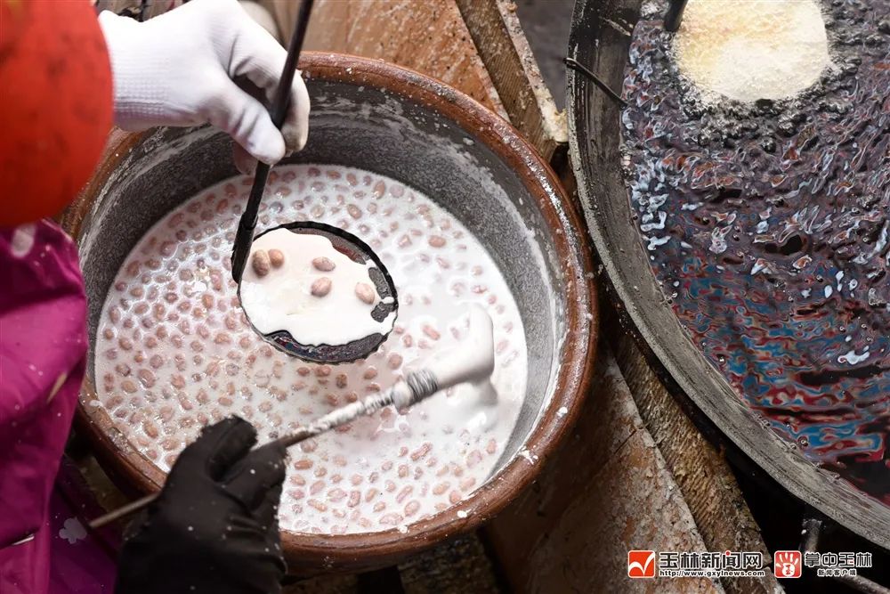 家住莲塘社区的陈奶奶一边回想着往事,手里的活也并未停下来。只见在她家门口搭起的简易灶台下,烧得红通通的柴火,上面架着一口大铁锅,里边的热油正在翻滚。陈奶奶和亲属正坐在锅边制造地豆饼,她一手拿着小勺子,一手拿着模具,一边用小勺子往装着米浆及花生的桶里舀上一勺粘米浆和六七粒花生米。然后倒在模具中,悄悄摇两三下,让米浆均匀铺在模具上,再把模具往油锅中放。