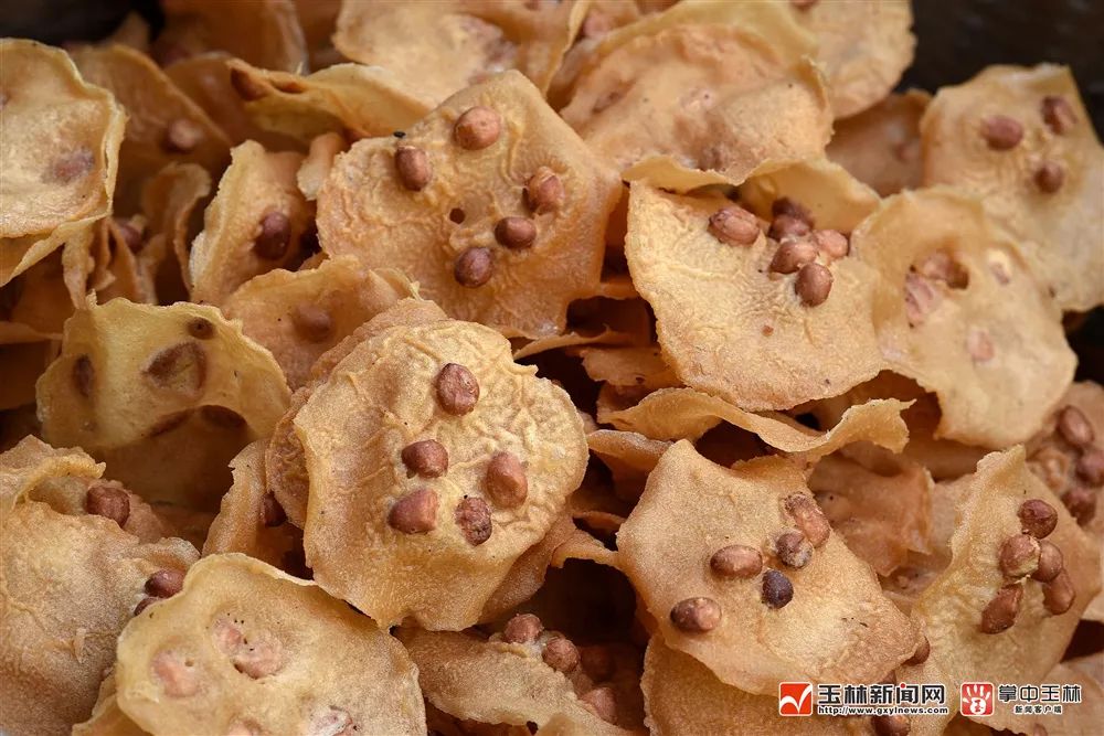 据了解,看似简略的地豆饼要做得好吃又美观也是有技巧的:花生米要事先泡好,粘米浆要调和洽,要放恰当的盐,还有少许甘草粉等配料。公然,拿起一个地豆饼放入嘴里,咔吱一响,又香又脆,便是这一个味!薄脆的饼,咸香适中,夹杂着酥脆的花生,一边从口腔中迸发出噼里啪啦的爆炸声,一边从味蕾里散发出停不下来的诱人香味,吃完还满口回甘。