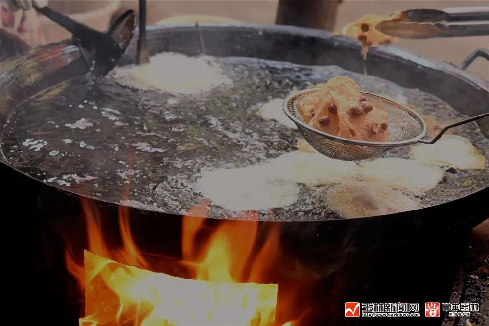 米浆一入油锅便很快从模具中掉落,本来白花花的米浆变成了金黄色。这时另一个人则快速用夹子悄悄夹起,翻面,10余秒就可以捞出油锅,放在漏油勺中,滤油顷刻,即可晾凉食用了。一人担任火候,一人担任舀浆制造,另一人则担任捞起滤油,3个人配合得趁热打铁,用陈奶奶的话说,“制造地豆饼有必要咱们齐心协力,一个人是做不来的”。