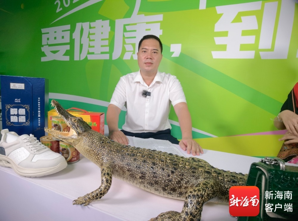 最具特色的当属三家镇镇长许高逢的推介——他身旁摆放着一座栩栩如生的鳄鱼标本,桌上摆放着鳄鱼皮制手提包、鳄鱼皮制运动鞋等多种好物。“难得今天有机会第一次在直播间对着镜头,把家乡的宝贝——三家鳄鱼以及咱们镇生态种养的好东西,实实在在推荐给大家。”